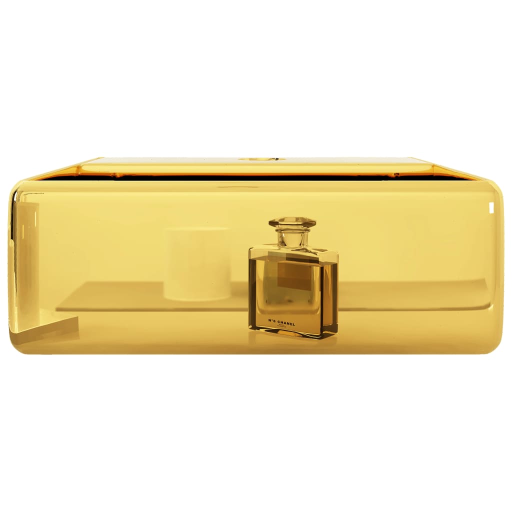 Questo lavabo non solo è pratico nell'uso quotidiano, ma costituisce anche un elemento decorativo in qualsiasi ambiente. Grazie al suo design di tendenza e contemporaneo, caratterizzato da un colore oro brillante, il lavabo si adatta alla perfezione a qualsiasi stile di arredamento. Realizzato in ceramica, il lavello è molto facile da pulire. La finitura lucida fornisce al prodotto un ulteriore tocco di stile. Il lavello è dotato di un foro per l'installazione di un rubinetto.