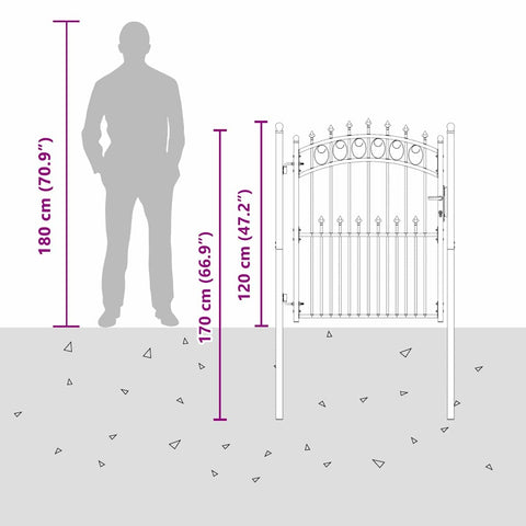 Questo cancello con spuntoni rappresenta la semplicità moderna, con una struttura in acciaio verniciato a polvere dalle linee pulite e pochi fronzoli. È pensato per ambienti esterni come giardini e terrazze, combinando perfettamente stile e praticità. Il design ad arco lo rende non solo funzionale, ma anche un elemento bello per qualsiasi spazio esterno. La costruzione robusta assicura prestazioni affidabili in diverse condizioni atmosferiche.